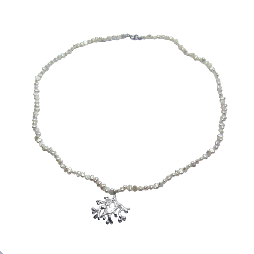A pearl necklace strung with organically shaped freshwater pearls, each one unique in luster and form. At the center, a delicate coral detail serves as the emblem, a sculptural accent that contrasts and complements the warm glow of the pearls. The combination evokes sea-born elegance and timeless sophistication, a piece that feels both natural and intentionally refined.