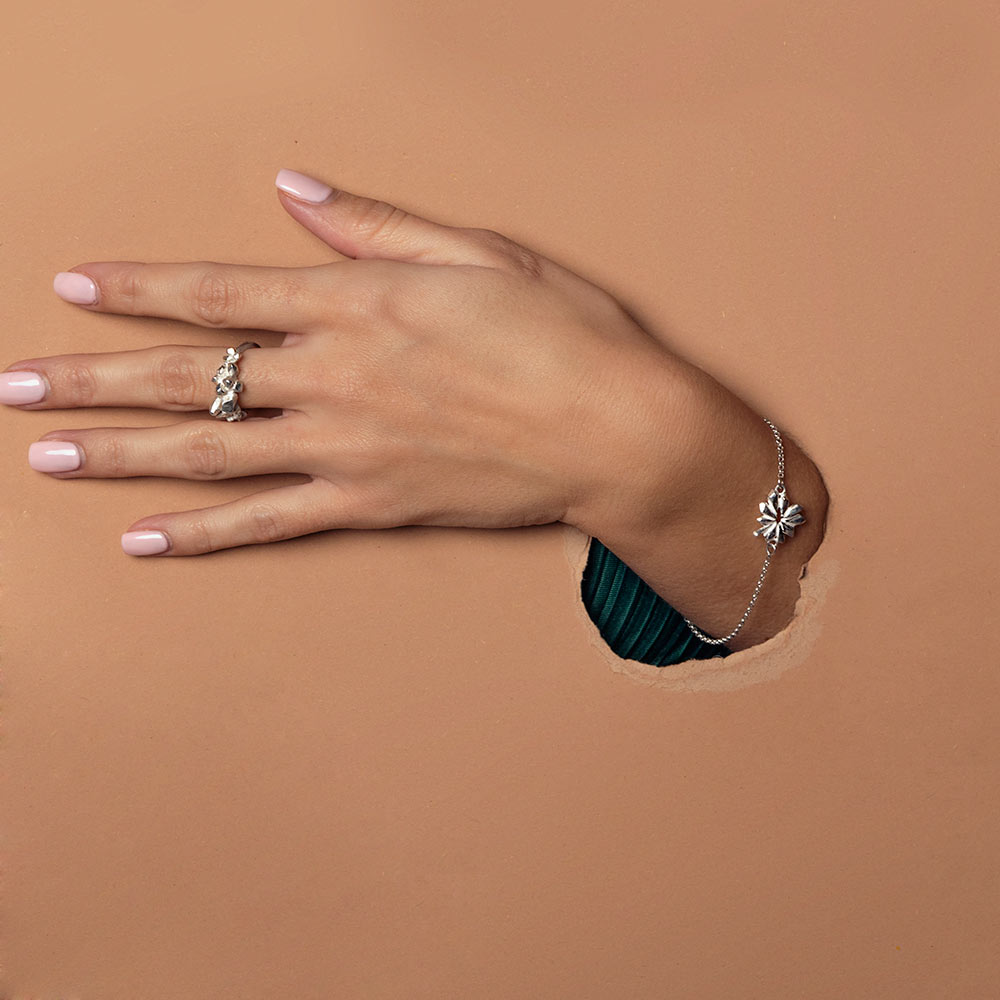 Nakit se ob rednem nošenju spreminja z vami. Na začetku je nakit nov in bleščeč, z vami pa bo pridobil povsem novo zgodbo. Še posebej srebro, ki je močno podvrženo vplivom iz okolja, hitro pridobi temno patino. Srebro namreč reagira z žveplom v zraku, zaradi česar se na površini pojavi patina. Na začetku kot plast rumenkaste, ki potemni na rjavo in nazadnje na črno. Na tistih mestih, kjer se nakit drgne ob telo, ostane kovina bleščeča, saj ga z nošenjem nezavedno poliramo. Večina mojega nakita je močno teksturiziranega, tako se ob potemnitvi linije poglobijo in ustvarijo povsem nov videz.