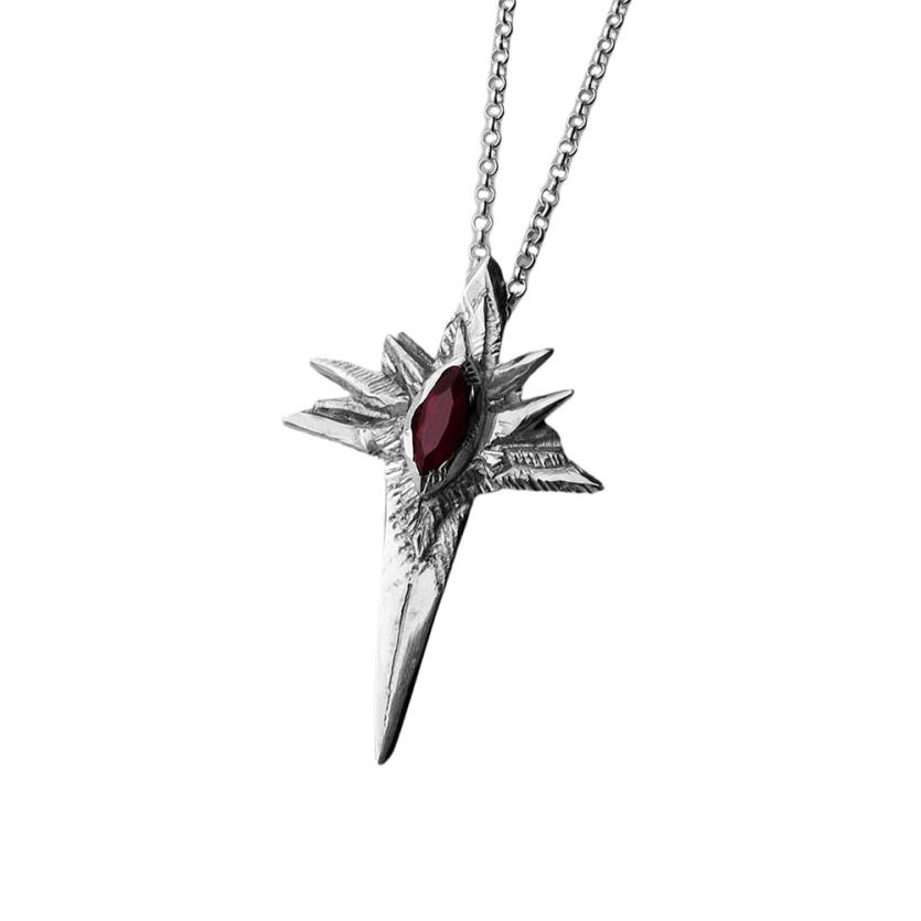 Izrazite svojo moč in strast z edinstveno srebrno ogrlico v obliki kristalnega meča. Njena strukturirana kristalna površina oblikuje bleščeč meč, ki simbolizira pogum, odločnost in prefinjenost medtem ko granat v središču meča prinaša simboliko ljubezni, življenjske moči in zaščite. Granat, znan kot kamen strasti in vztrajnosti, podpira notranjo moč in odločnost. Ogrlica je oblikovana na daljši srebrni verižici, ki poudari dramatičnost kosa in omogoča, da ga nosite kot osrednji element vašega videza. Popolna izbira za tiste, ki želijo nositi nakit z zgodbo in pomenom.