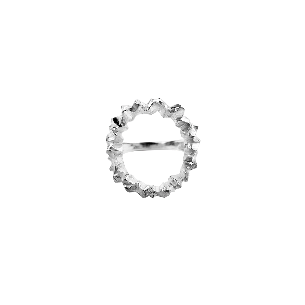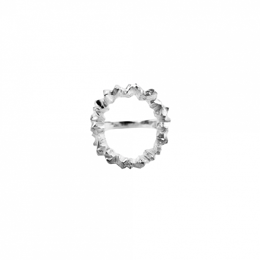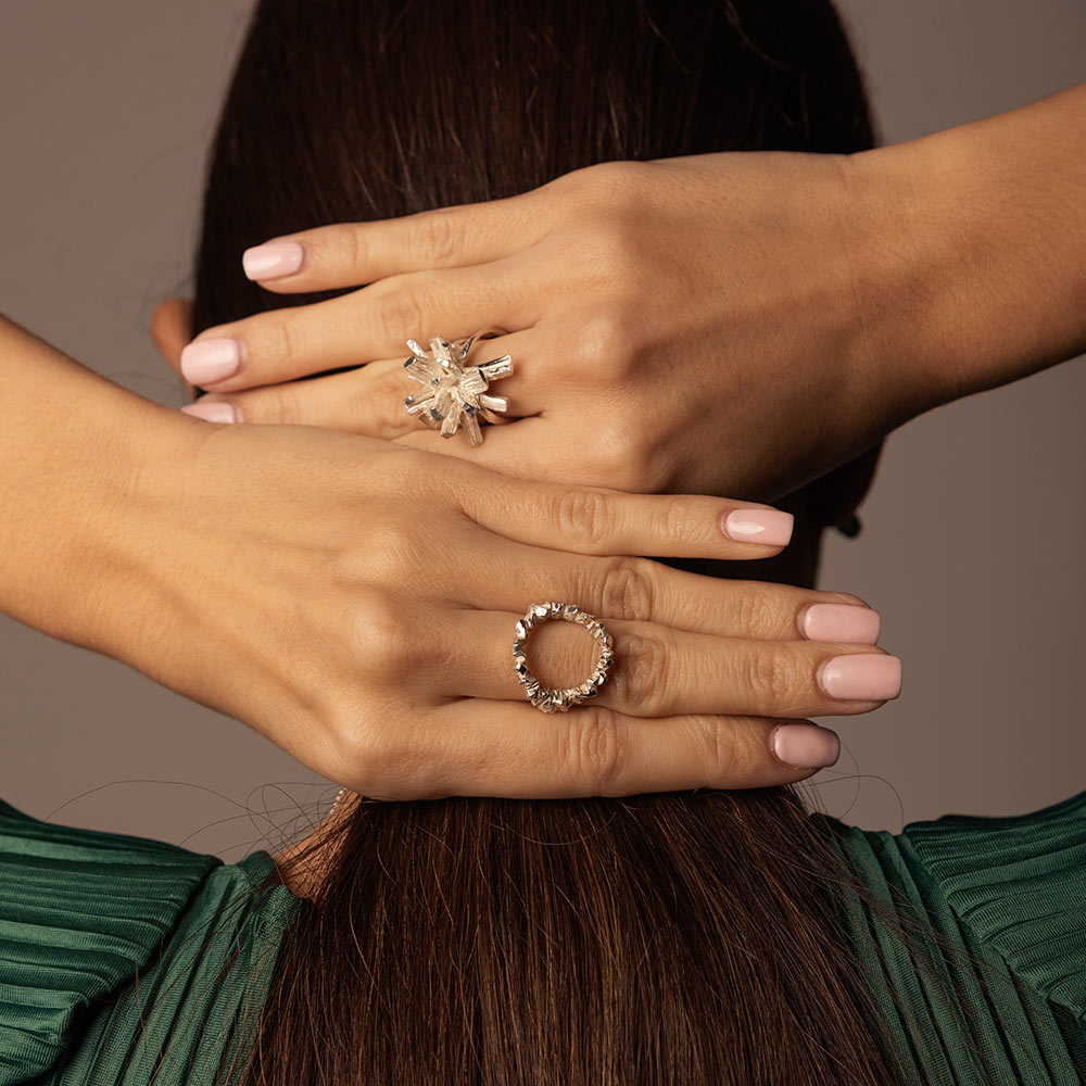 Zasijte z dramatičnim prstanom v obliki sončnega oboda, ki ga sestavljajo žarkasto razporejeni kristali.