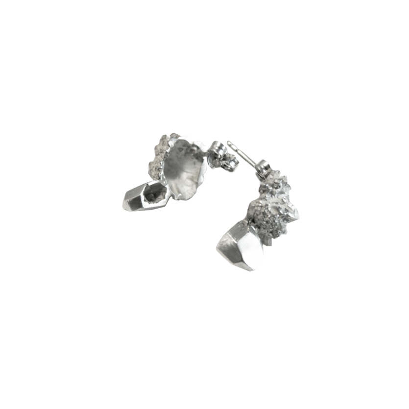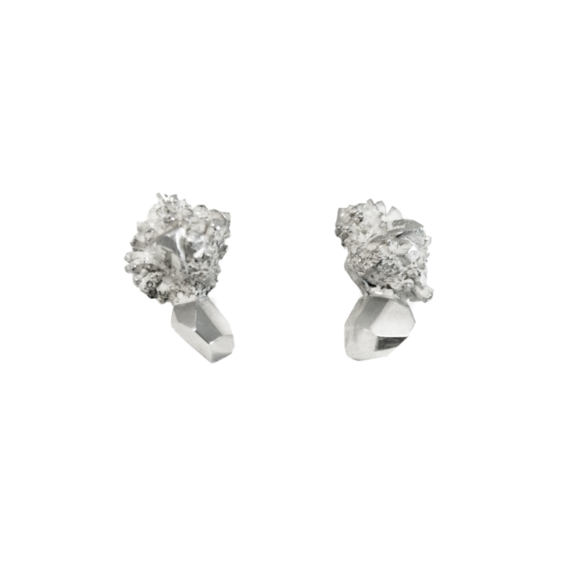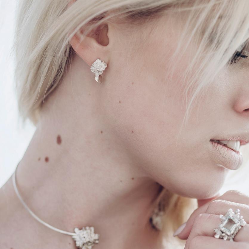 Osrednji elementi kolekcije 'Čisti kristal' so iskrive kristalne strukture, ki na videz delujejo, kot da so v simbiozi s človeškim telesom. Geometrijski kristali s svojimi ravnimi linijami in organsko rastjo ustvarjajo dinamično igro kontrastov; med grobim in nežnim, med organskim in geometrijskim. Oblike kristalov dopolnjujejo prosojni dragulji, ki poudarjajo njihov lesk in teksturo. Kolekcija je namenjena odločnim posameznikom z izostrenim občutkom za estetiko, ki ljubijo čiste linije v kontrastu z neukročeno naravo.